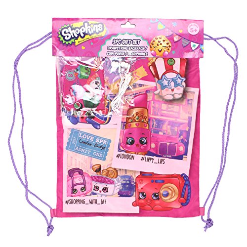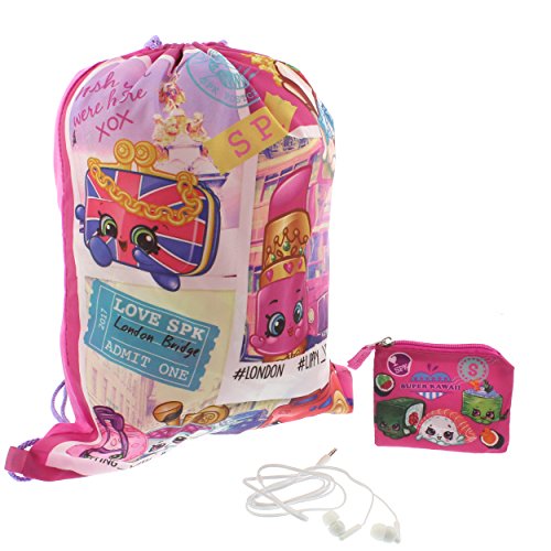 Product Description This awesome 3 piece Shopkins gift sets includes a drawstring backpack, a set of headphones, and a coin purse! This gift set features some of your favorite Shopkins characters like, Lippy Lips, Poppy Corn, Britney Bag, Cam Camera, Olive Overnight Bag, and Marcee Makeup Bag! This set includes a coin purse with a zipper closure and your little shopper can easily carry books, gym clothes, school supplies, snacks, and more with the cool cinch sack bag! This gift set is perfect for any Shopkins fan and they make a great stocking stuffer for the holidays! 0