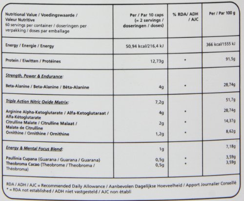 Product Description Sophisticated Beta Alanine Pre-Workout;7.2 gr of Triple Action Nitric Oxide Booster;Slow down lactic acid production and train harder;For explosive power and strength;Muscle vascularity and Size 0