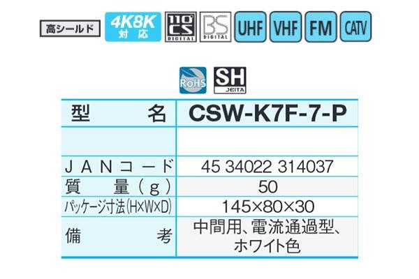fk094igrjsTV入力・出力間電流通過型テレビ端子です  サイズ 個装サイズ:3×8×15cm 重量 個装重量:60g 製造国 日本 4K・8K衛星放送に対応  TV入力・出力間電流通過型テレビ端子です