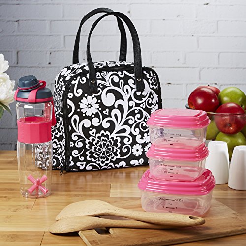 Fit & Fresh Wichita Insulated Lunch Bag with Reusable Container Set and 24 ounce Active Sport Bottle (Black & White Floral)