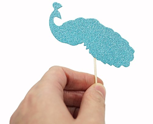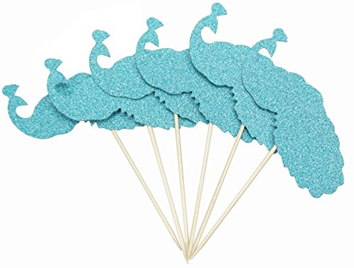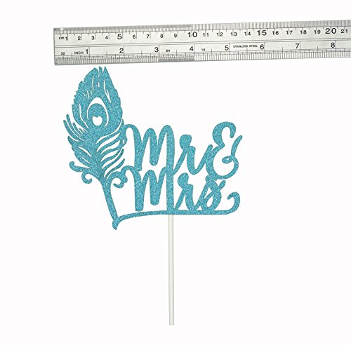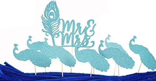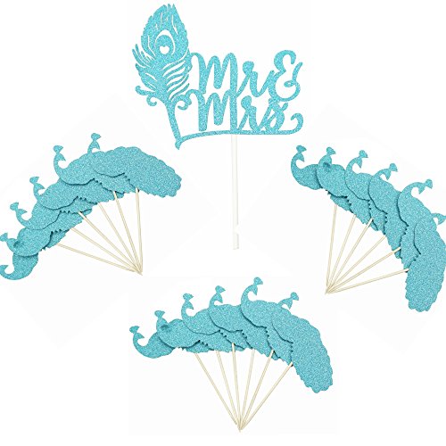 Shxstore Glitter Aqua Peacock Feather with Mr. and Mrs. and Peacock Cake Cupcake Toppers Picks for Wedding Cake Cupcake Decorations, Set of 19