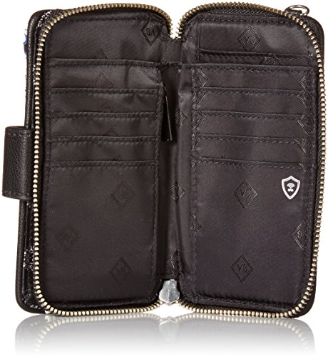 Signature cotton is colorful, lightweight and packable. Provides rfid protection for credit and debit cards. Accommodates an iPhone 6. Phone slip pocket on exterior. Eight credit card slip pockets, one slip pocket, one bill pocket and an id window. Pin snap and zip closures.