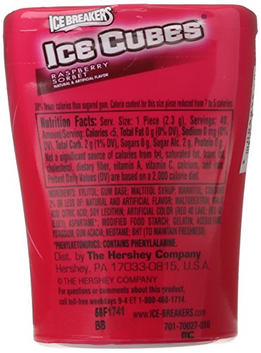 Keep breath fresh with ICE BREAKERS ICE CUBES Raspberry Sorbet Chewing Gum. Stimulate taste buds with this long-lasting minty chewing gum. Packed with fruity flavor crystals, each sugar free piece of gum releases a blast of invigorating breath-freshening flavor. Keep a container in the car cup holder, a purse or backpack, or at the office for instant minty refreshment anytime. Sugar free ICE BREAKERS ICE CUBES Raspberry Sorbet Chewing Gum contains phenylalanine and may cause discomfort to the mouth with intense cooling. Lock in freshness with the snap-close lid. This product ships as a 40-count package.