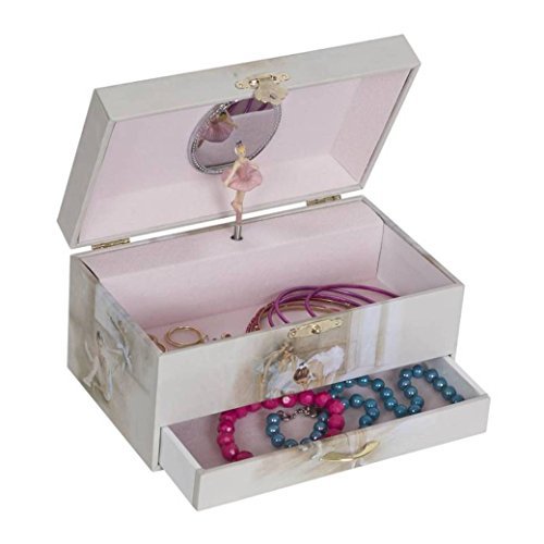 - Feature : Decorated Paper in Little Ballerinas design, Interior oval mirror / Twirling ballerina, Plays Swan Lake / Open area storage on top, Single drawer also offers open area storage / Hand lined in pink sueded fabric, Gold tone latch and drawer pull / Approx. Dimensions: 7 3/8 x 4 3/8 x 3 3/4