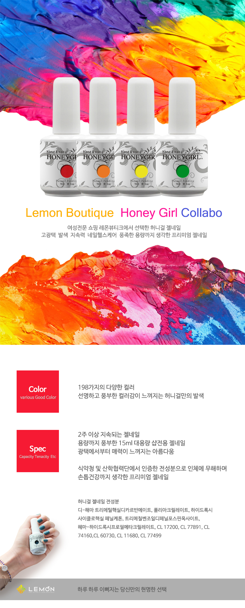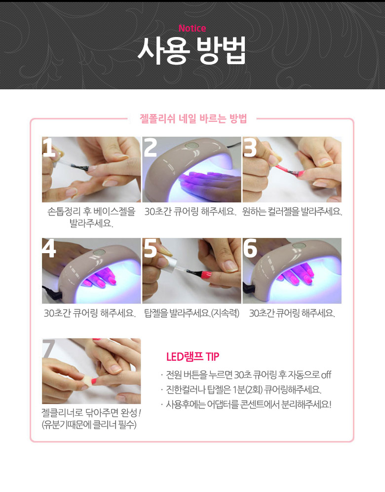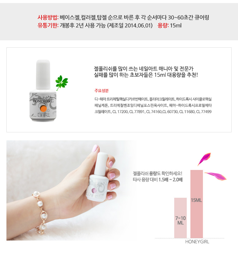 - 사용방법"※허니걸 젤은 LED램프와 UV램프36W에서 큐어링 됩니다. 참고하세요! 1. FOUNDATION GEL(베이스코트)을 바른 후 짧게 큐어링을 합니다. UV램프는 LED보다 오래 큐어링 해 주세요! 2. 큐어링 후 원하는 색상을 발라 주신 후 큐어링을 해 주십니다. (LED램프 약30초, UV램프 약2분 기준.) 3. TOP IT OFF(탑코트)를 발라 주신 후 마지막으로 큐어링을 2번과 같이 해 줍니다. 4. 젤 클렌져로 남아 있는 기름기 또는 잔여물을 닦아 줍니다. "