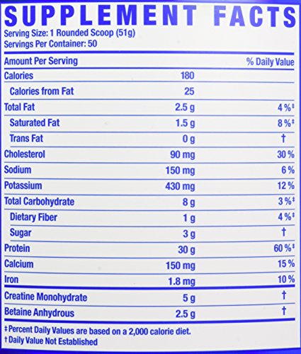 29G protein with 13.5 EAA's^Sustained release protein matrix^Boost strength with 5G creatine and 2.5 gram betaine^Unreal flavor fit for a king^Only 1 gram sugar and aspartame free