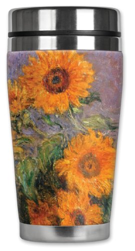 Mugzie Monet Sunflowers Travel Mug with Insulated Wetsuit Cover, 16 oz, Black