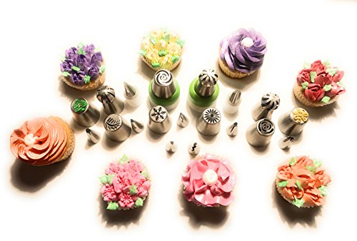 - •GREAT VALUE! Russian icing tips, ball tips, vertical/ruffle tips, single, tri-color and small couplers for leaf and vertical tips, reusable silicone bags, disposable piping bags and a chart that shows what beautiful and amazing flowers each tip makes. •HIGH QUALITY GUARANTEE Pro Tips are made of high quality stainless steel, extremely durable, non-stick and dishwasher safe. We guarantee satisfaction of this amazing cake decorating set so don't hesitate to contact us with any questions