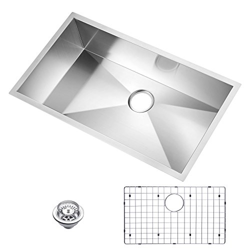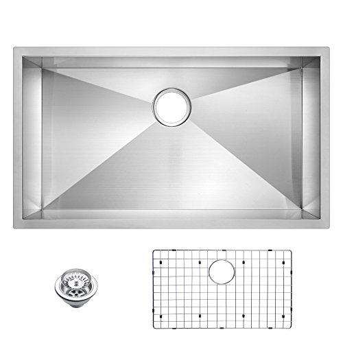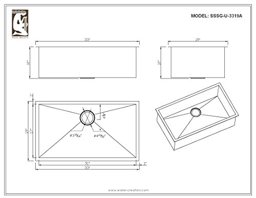 Water Creation SSSG-U-3319A 33" X 19" Zero Radius Single Bowl Stainless Steel Hand Made Undermount Kitchen Sink with Drain, Strainer, and Bottom Grid Premium Scratch Resistant Satin Stainless Steel