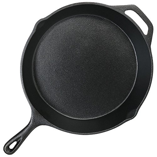 - Pre-seasoned cast iron 12" fry panYour delicious homemade recipes are about to become even more special when cooked in this pre-seasoned cast iron skillet. The cast iron can be used to cook over a campfire or on top of your stove at home, the two sturdy handles allow for easy lifting and hanging. This cast iron also features two side lips which allow you to safely pour out any liquids from inside the pan. This skillet retains more heat than other regular pans due to its durable cast iron material, helping your food turn out warm and fresh. Plus, cooking your food in a cast iron skillet can increase iron content in your diet.