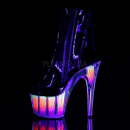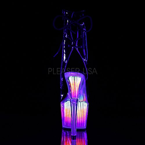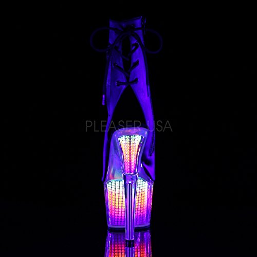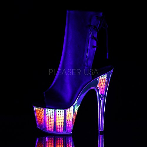 Studio : Pleaser Publisher : Pleaser Binding : Apparel Product Description 7 (18cm) heel, 2 3/4 (7cm) platform open toe/heel lace-up back ankle boot with hidden zip pocket featuring neon uv reactive, simulated rhinestone filled platform bottom, inside zip closure 0