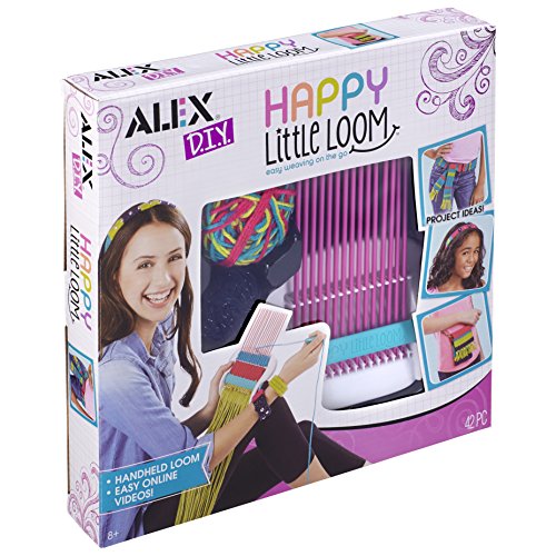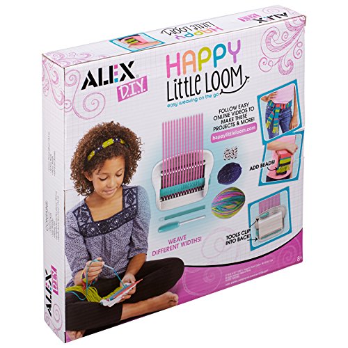 ALEX DIY Happy Little Loom weaving tool is the simplest loom you will ever use. The portable hand held loom lets you weave in multiple widths. Depending on the size of your project, insert 2-15 rods into the holder and weave away! The weaving tool and threader make it easy! Great to use while watching TV, on a car trip, at sleepovers or practically anywhere. When you’re finished, the easy to use tools snap into the back for compact travel. The loom is customizable so you can make a variety of projects such as belts, bracelets, scarves, headbands, purse, phone case and much more. Includes a handheld loom, 15 rods, weaving tool, easy threader, 80yds. (73.1m.) of brightly colored yarn, 20yds. (18.3m.) of cotton thread, plastic needle, 20 pony beads, and easy instructions. Recommended for children 8 years of age and older.Feature