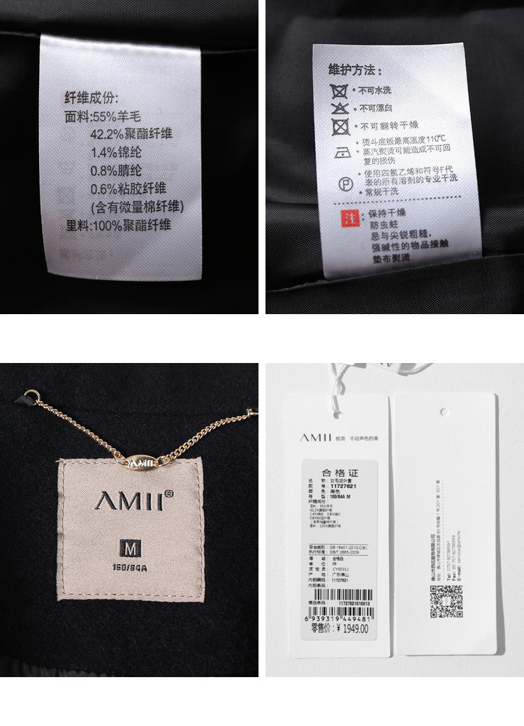 | 面料成分: | 黑色:面料:55%羊毛 42.2%聚酯纤维 1.4%锦纶 0.8%腈纶 0.6%粘胶纤维(含有微量棉纤维) 浅杏:面料:47.5%羊毛 40.4%聚酯纤维 4.7%粘胶纤维 4.1%腈纶 3.3%锦纶 里料:100%聚酯纤维 |
