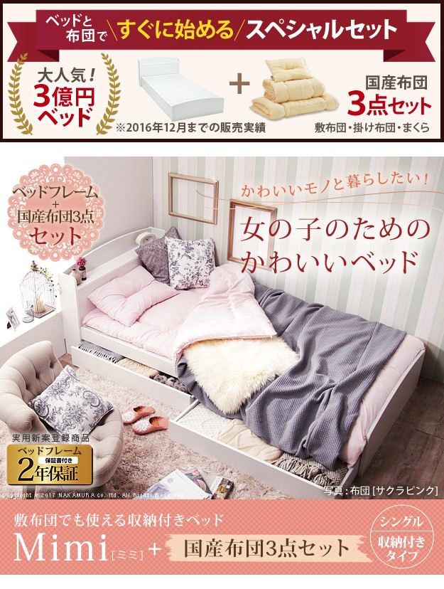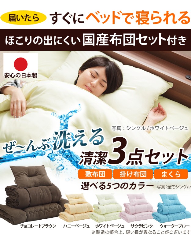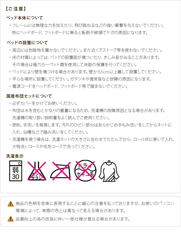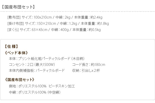 ※メーカー直送のため代金引換はお受けできません。※沖縄・一部離島は別途送料がかかります。お見積もりいたしますのでお問い合わせ下さい。●安心のメーカー2年保証(ベッドのみ)【セット構成】ベッドx1掛け布団x1敷き布団x1まくらx1【カラーバリエーション】■布団セットチョコレートブラウン・ハニーベージュ・ホワイトベージュ・サクラピンク・ウォーターブルー【仕様】■ベッドフレーム本体:プリント紙化粧パーティクルボード本体内側補強板:パーティクルボードコンセント:2口(フタ付き)合計1500Wコード長:約1.8m◎組立品■布団セット側地:ポリエステル100%(ピーチスキン加工)中綿:ポリエステル100%(中空綿)【サイズ】■ベッドフレーム幅105x奥行218x高さ69.5cm・約69kg宮上有効サイズ:幅101x奥行13cm■掛け布団約210x150cm・約1.8kg/中綿:約1.2kg■敷き布団約210x100cm・約2.4kg/中綿:約2kg■まくら約63x43cm・約0.5kg/中綿:約400g株式会社ナカムラ(I-3500642)