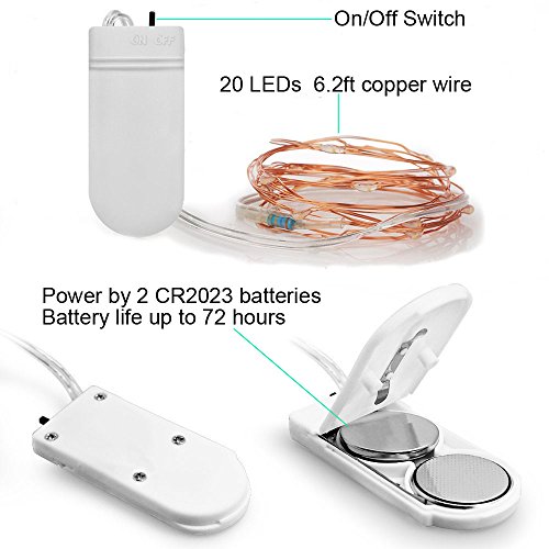 -. Feature : WIDELY USE: Comes with 6 different colors lights,the copper wire is flexible but sturdy, perfect for party, wedding, concert, Christmas, Halloween, both indoor and outdoor decorations. / OPERATE EASILY: With on/off switch,the string lights are easy operation and use. It can keep lighting for 72 hours with 2pcs CR2032 batteries. / WATERPROOF: Insulate copper wire and fully sealed LEDs, the part of copper wire is waterproof, the string light can achieve amazing lighting effects. Notice: The battery box is NOT waterproof. / MINI SIZE: The size of battery case is only 0.75*2 inch, which is easy to hide and won't reduce the beauty of decors. / 100% Satisfactions and Money-Back GUARANTEED: We take full responsibility for our product and customer dissatisfaction. If you are not satisfied with the String Lights, just return them within 30 days for a full refund or a new replacement.