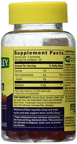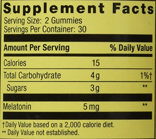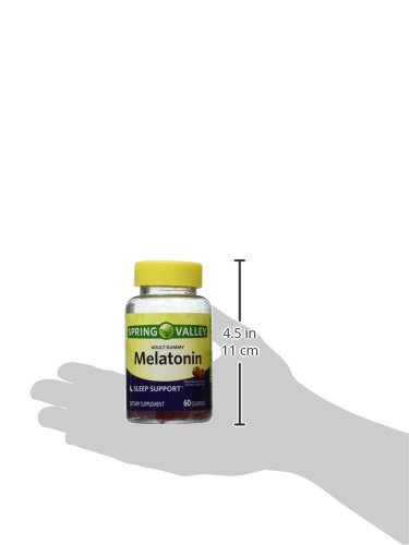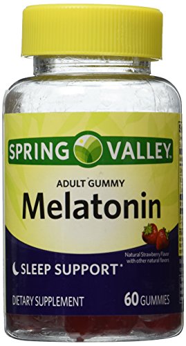 -. Binding : Health and Beauty -. Brand : Spring Valley -. EAN : 0681131056915 -. Feature : Adult Gummy. / Melatonin 5 mg per 2 Gummies Serving. / Sleep Support. / Natural Strawberry Flavor with other natural flavors. / 60 Gummies. -. Label : Wal-Mart Stores, Inc. -. LegalDisclaimer : The statements in this page have not been evaluated by the Food and Drug Administration. This product is not intended to diagnose, treat, cure or prevent any disease. -. Manufacturer : Wal-Mart Stores, Inc. -. PackageQuantity : 1 -. ProductGroup : Health and Beauty -. ProductTypeName : HEALTH_PERSONAL_CARE -. Publisher : Wal-Mart Stores, Inc. -. Studio : Wal-Mart Stores, Inc. -. Title : Spring Valley Adult Gummy Melatoning 5mg - Natural Strawberry Flavor - Single Bottle with 60 Gummies -. UPC : 681131056915