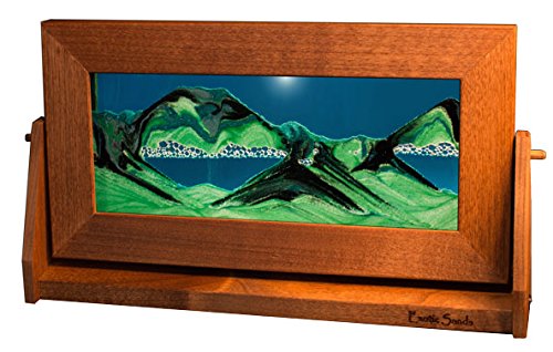 Medium Horizontal 7x12 Inch OD Moving Sand Pictures. The double strength glass is framed with a quality knotty alder wood frame. Air bubbles hold up the sand creating unique scenes with every turn, pictures may take from just minutes to many hours to finish a scene. The black sand is heavier than the white sands so the sands will never mix. Some of the sands are transparent and some opaque giving the pictures a 3-D effect. Ocean Blue - Blue liquid with black sand, four types of white sands and a fine blue glitter. Summer Turquoise - Turquoise liquid with black sand, green sands from South America, four types of white sands and a hint of fine sea foam green glitter. Sunset Orange - Orange liquid with black sand, coral pink sand from Southern Utah, four types of white sands and a hint of fine copper glitter. Arctic Glacier - Clear liquid with black sand, four types of white sands and a hint of fine blue glitter.Feature