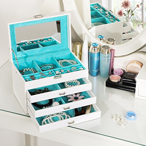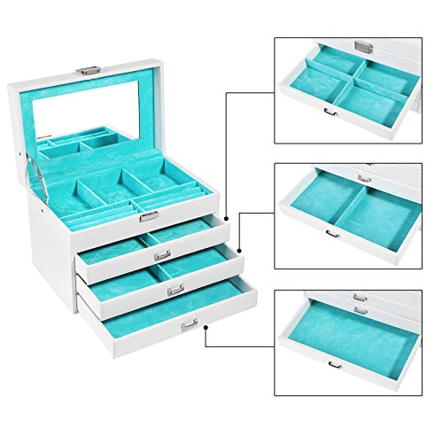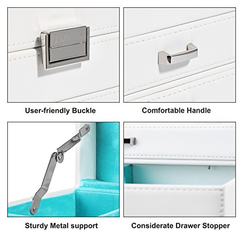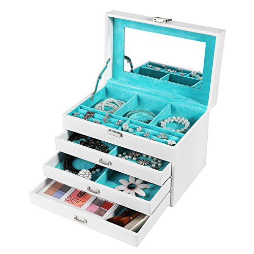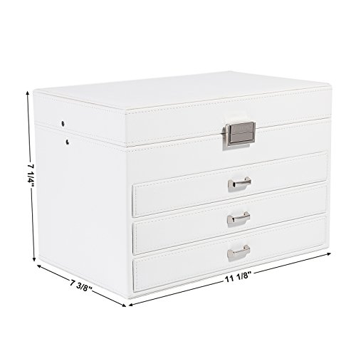 -. Feature : PREMIUM JEWELRY BOX: Crafted from high quality white faux leather & soft blue velvet, a perfect gift for women and girls to protect their beloved jewelry from scratches and damage / DIVERSE COMPARTMENTS: As a multifunctional jewelry organizer, top layer includes 2 large ring cases, 3 jewelry compartments to hold necklaces, bracelets, earrings, hairpins, cufflinks, and brooches etc. / 3 DRAWER DESIGN: 3 storage drawers feature easy-to-grab handle & drawer stoppers to prevent accidentally pulling the drawer completely out and spilling the contents; drawer compartments of various sizes for storing different jewelries / CONSIDERATE DETAILS: Delicate lock catch for one-hand easy opening, easy to use and saving your time; the lid has a metal hinge attached to prevent the jewelry storage case from falling back / PRODUCT SIZE: Measures 11 1/8"L x 7 3/8"W x 7 1/4"H (28.3 x 18.8 x 18.5cm), perfectly fit your vanity or dresser