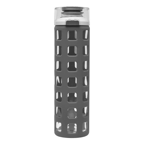 The Ello Syndicate 20-Ounce Glass Water Bottle is the perfect way to enjoy your favorite beverage in style. This bottle looks and works great on a table at home, on the treadmill at the gym, next to your towel on a sandy beach, at your desk at work or in your cup holder while you are on the go. Ice cubes can easily fit in the mouth of this water bottle which has been designed to provide the perfect drip-free sip whenever you need it. The one-handed push button lid has a convenient carry loop to bring this bottle wherever you go and is ideal when you need to grab a quick sip without letting go of your momentum, steering wheel, shopping bags, or anything else. For your comfort and enjoyment, this water bottle has been enhanced with a comfort silicone grip and clean tasting glass, making it the perfect vessel for water. Ello glass bottles preserve the taste and temperature of your favorite beverage to provide you with the luxurious experience you deserve. This bottle is easily cleaned in a dishwasher and is BPA, phthalates, PVC, lead and cadmium free for your safety. Do not freeze this product or use it in the microwave. Ello is dedicated to creating stylish drink ware that provide our customers with the perfect pick-me-up to brighten up their day.Feature