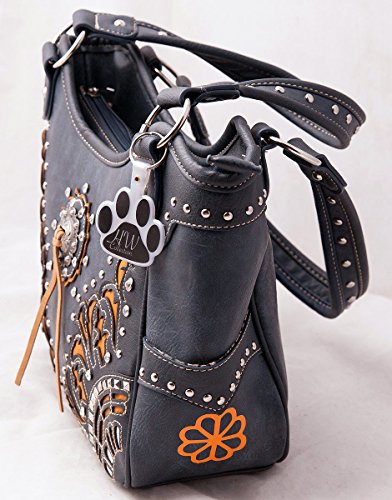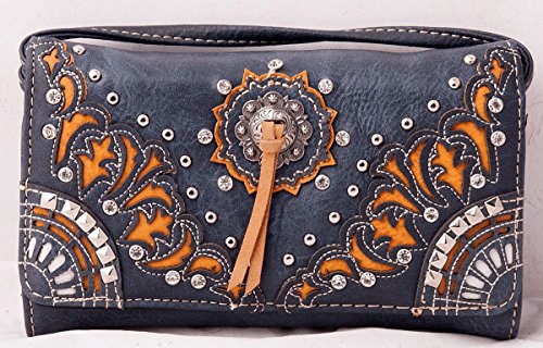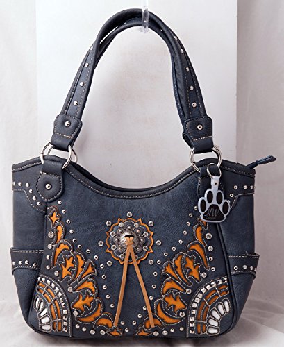 Western handbag ; made from high quality premium faux/imitation PU blue leather decorated with rhinestones, silvertone hardware, silvertone floral concho with hanging tassel, colorful laser cut designs and detachable HW Collection key ring/purse charm on the front