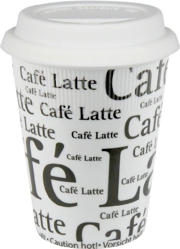 Konitz Cafe Latte Writing on White 9-Ounce Travel Mugs and Silicon Lids, White, Set of 2