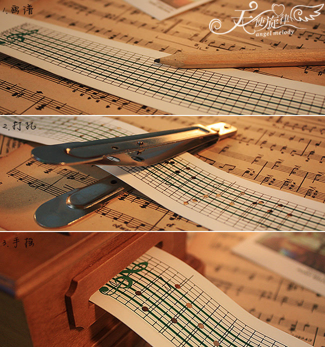 3张是空白的用来谱曲,1张是谱好曲用来练习打孔,1张是打好孔谱好曲,可以直接手摇的。