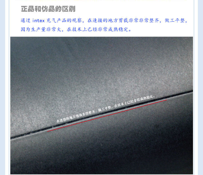品名:INTEX-深蓝灯芯绒双人空气床 型号:68759 规格:152cm×203cm×23cm 配送:INTEX专用修补片(在包装盒子口) 中英文说明书 修补薄膜(白色四方 盒子内) INTEX充气床特点 ★ 设计合理:重型卡车也压不坏的充气床,单人床承重150KG,双人床承重272KG以上,耐冲撞5000次以上,INTEX充气床采用特殊的蜂窝状充气设计,使不同体重的两个人睡在上面,决不会出现空气全往一边跑的现象。 美国INTEX全球大的充气休闲用品品牌,占世界同类产品市场的55%、美国市场的75%。其产品以款式新与高质量引导世界充气产品的潮流,成为中央电视台、各地卫视热播热卖的时尚精品。全球设有美国、中国厦门等四个大型的仓储物流基地,以及中国香港及厦门等四个行销服务中心,在全球超过100个国家进行INTEX系列产品的行销和服务。 ●依据“人体工学”原理设计,利用空气的浮力能将人的身体均匀托持,实现睡床与人体紧密贴合,颈椎、腰椎、腿腕不再悬空,有利于尽快消除疲劳,为您创造自然、舒适、健康的优质睡眠! 维修说明 一、充气床会不会漏气?若不小心扎破了怎么办? 二、充气会不会很累? 三,关于价格的合理性? 四,关于售后的问题? 五,蜂窝(立柱)式和拉带(工字)式结构有什么区别? 六,充气床在夏季和冬季怎样使用? 七,充气床的使用及保养 八,充气床能清洗吗? 九,如何修理损坏的充气床? B、修补划破口或烫坏口: C、绒面修补: D、其它事项: 关于INTEX充气产品售后服务的规定 | ||||||