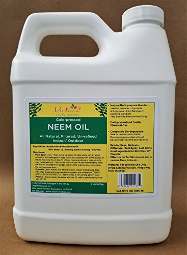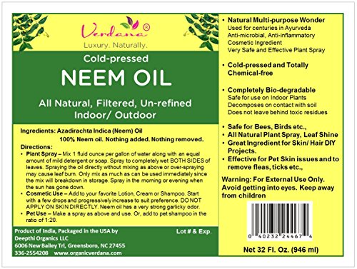 Organic Verdana Cold Pressed Neem Oil - 32 Fluid Ounce – Un-refined, Filtered - High Azadirachtin content - For Indoor and Outdoor Plant Spray - Plant Care, Pet care, Skin Care, Hair Care