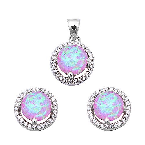-. Title : Halo Lab Created Pink Fire Opal & Cubic Zirconia .925 Sterling Silver Earring & Pendant Set