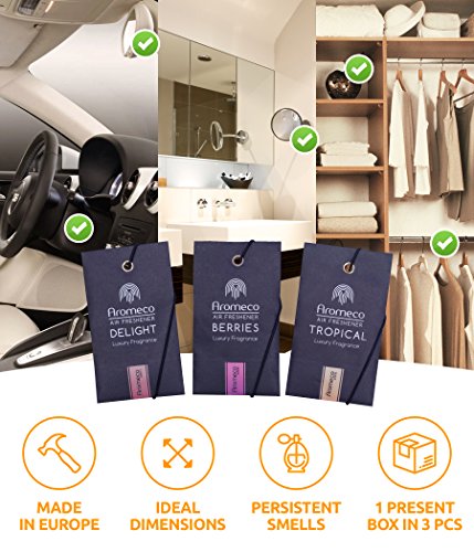 A PACK OF 3 AIR FRESHENERS PER BOX – Enjoy a variety of 3 luxury air fresheners; Tropical, Delight and Berries. Specifically designed to be sophisticated and elegant designer fragrance. These 3 scented sachets are ideal for both ladies and gentlemen even for wardrobe freshener. Expect nothing but elegance and sophistication.