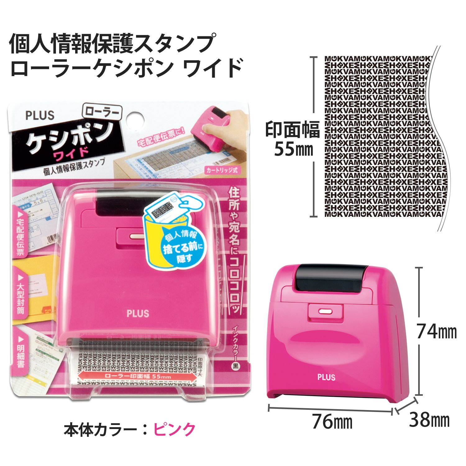 大切な個人情報を保護するスタンプ、宅配伝票や明細など幅広い範囲に便利な「ローラーケシポン ワイド」 規格:ワイド / 印面幅:55mm / 本体カラー:ピンク / インク色:黒 外形寸法:W76×D38×H74mm / 捺印距離:約50m分(800回捺印相当、1回60mmの場合) 材質:本体=PS・ABS・POM、カートリッジ=ABS・POM・PE、インク:油性顔料 ※インク液の補充はできません。交換時は別売専用交換インクカートリッジ、38-129(IS-017CM)をご利用ください。