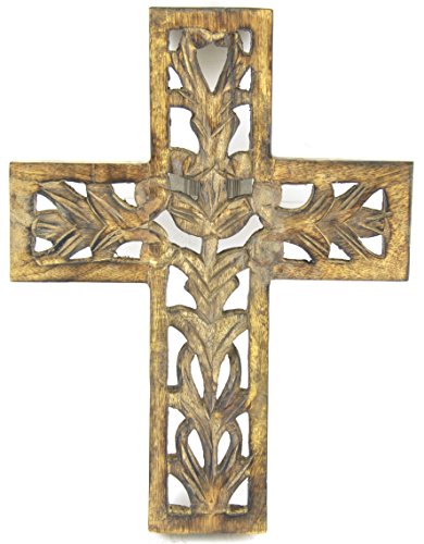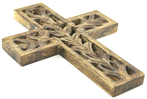 Hand Carved Rustic Wooden Cross Wall Sculpture Plaque, 12-inch