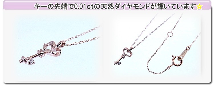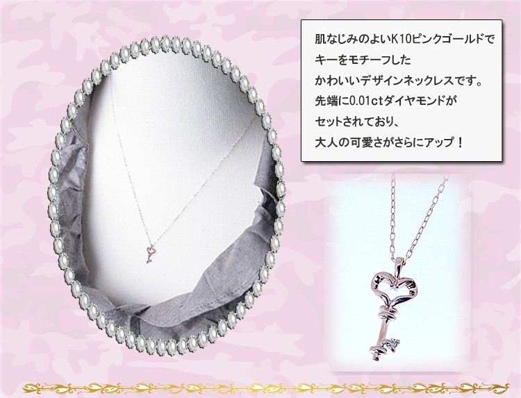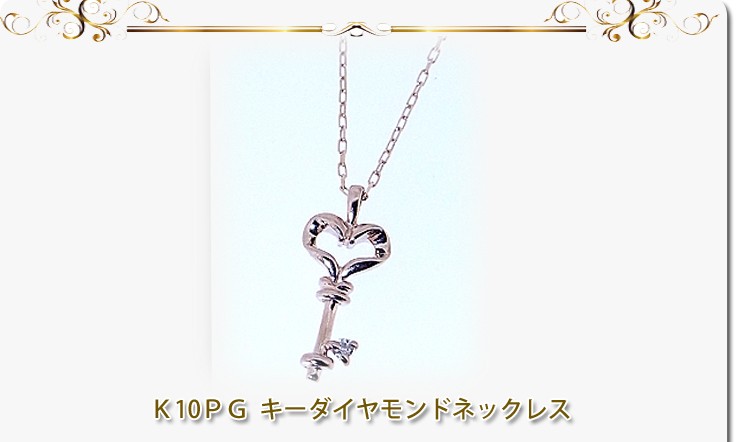 商品説明 肌なじみのよいピンクゴールドの鍵にダイヤモンドがセットされたかわいいネックレスです。