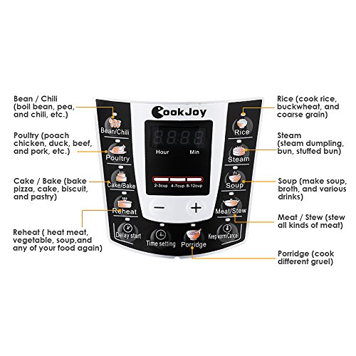 Want to cook delicious meals by your own? Afraid of wasting food? Nervous about you can't control cooking time?The rare opportunity is coming! Our COOKJOY Multi-functional Electric Pressure Cooker will allow you to try all kinds of food with multi programmable control cooking modes. A whole meal process of rice, meat, soup, dessert can be all finished by this fantastic high pressure cooker. With 10 safety protection of this pressure cooker, you don't need to care about any safety problems.Why not catch the chance to become a professional chef? COOKJOY electric pressure cooker is a multifunctional kitchen appliance, which can be served as a rice cooker, slow cooker, steamer, warmer and frying pan, etc. Specifications: - Capacity: 6L - Voltage: 120V ~ 50Hz - Wattage: 1000W - Working pressure: 40 - 70kPa - Limited pressure: 90kPa - Warm keeping: 65 - 75 degree - Pressure keeping: 2 - 99mins - Cable: 2.8 feet Package List: 1 * COOKJOY Electric Pressure Cooker 1 * Measuring Cup 1 * Rice Spoon 1 * Dual Rack 1 * AL Steamer 1 * English User Manual 0 |