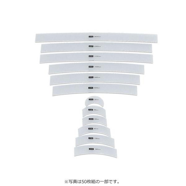 一枚一枚の定規にはそれぞれの曲線を表す弧の半径(アール)がmmで刻印されています。 製造国:日本 素材・材質:アクリル 仕様:最大長さ:400mm厚さ:2mm50枚組 ※サプライヤー直送品 ご注文後2~3営業日後の出荷となります【商品名】アール定規 アクリル製 50枚組 1-816-0050