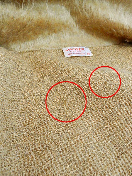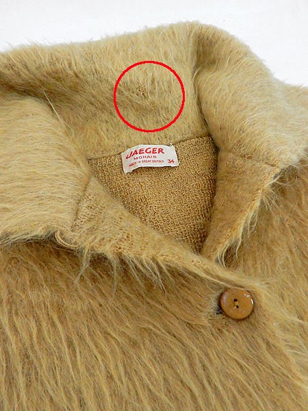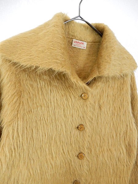 Ladies ブランドJAEGER カラーカラシ色 メール便不可 コンディション★★ 素材モヘア 表記サイズ34 スタッフコメントお探しの方も多い、とても毛足の長い貴重なモヘアニット。 ※長い毛足で分かりにくくなっていますが、小穴が多数あいています。 ※数か所小穴を塞ぐリペアを施してあります。 実寸サイズ 着丈 61 cm 身幅 49 cm 肩幅 35 cm 袖丈 59 cm ※ウエスト・ヒップ以外は平置き採寸