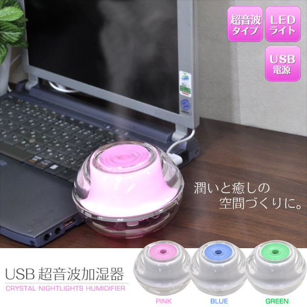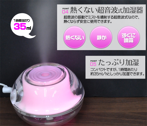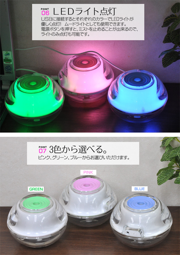 ■たっぷり加湿! コンパクトですが、1時間あたり約35ml/hとしっかり加湿できます。 ■各色LEDライト点灯! USBに接続するとそれぞれのカラーでLEDライトが優しく点灯! ムードライトとしても使用できます。 電源ボタンを押すと、ミストを止めることが出来るので、 ライトのみ点灯も可能です。