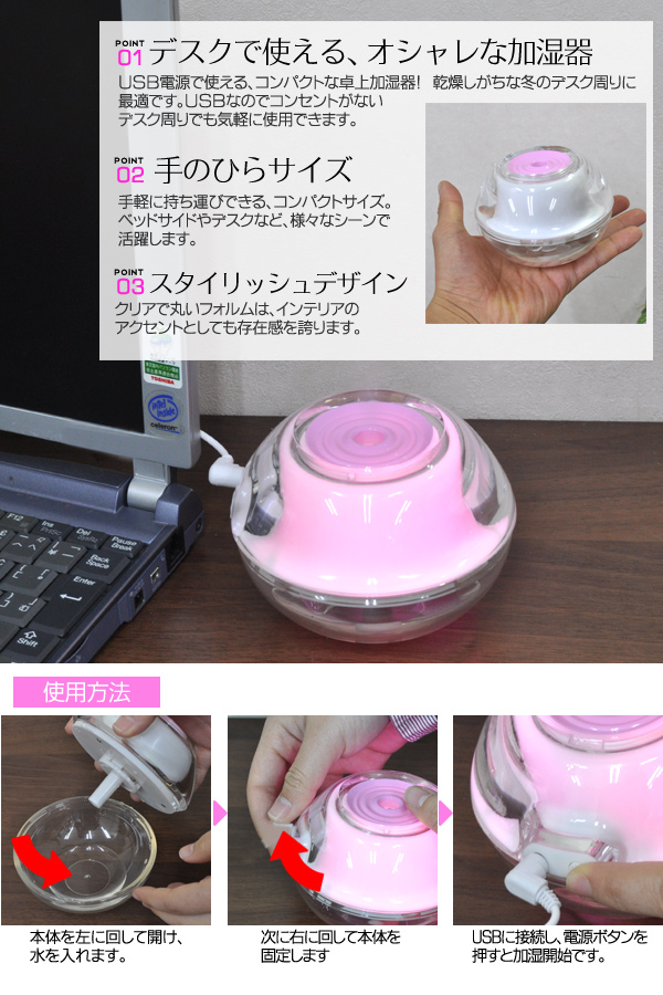 ■熱くない超音波式加湿器! 超音波の振動でミストを噴射する超音波式なので、 熱くならず安全に使用できます。 ■デスクで使える、オシャレな加湿器! USB電源で使える、コンパクトな卓上加湿器! 乾燥しがちな冬のデスク周りに最適です。