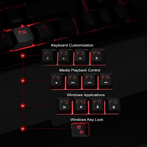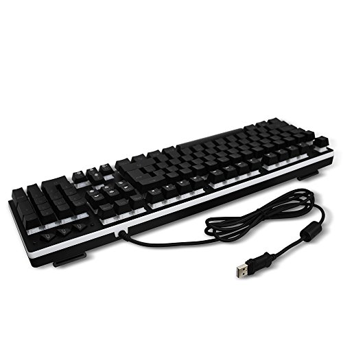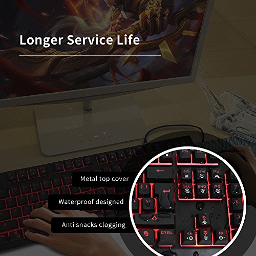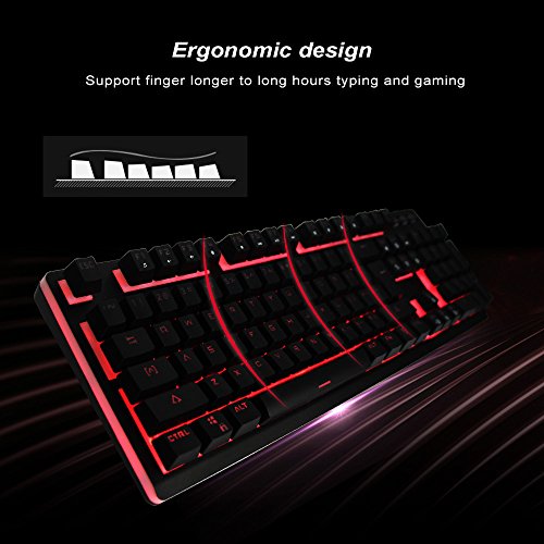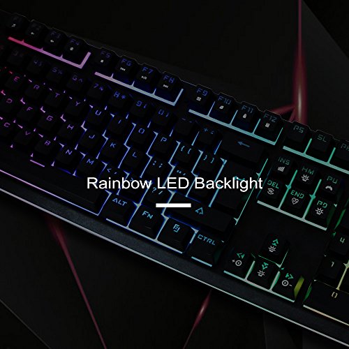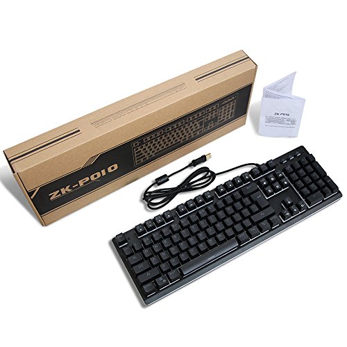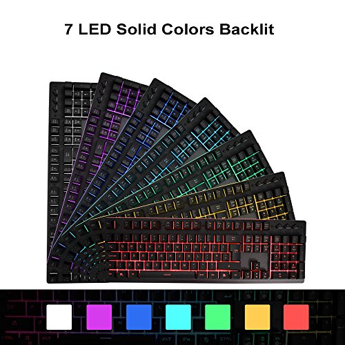 -. Feature : [Basic Key Information] 104-key Gaming Keyboard, 19 anti-ghost keys for professional gamers, double injection and removable key-cap, professional and durable, and set aside space for personalization / [7 Color LED Backlight] 7-color backlit keyboard 6 modes, you can choose from 7 kinds of solid colors (blue green purple yellow cyan white), or 7 colors alternately, or flowing like a rainbow, provide you with passion, vitality and dreamy experience / [Mechanical Typing Feeling] When you press you will feel resistance, and hear the click, special design for the game and typing to provide better tactile and auditory feedback, and enhance the keyboard's Durability / [Durable & Details] With durable metal top cover, waterproof designed , and do not have to worry about snack crumbs blocking key, enhances keyboard service life / Compatible with Windows 2000/ ME/ XP / NT/ Vista/ Win7/ Win8/ Win10/Android/Linux, Mac and other systems