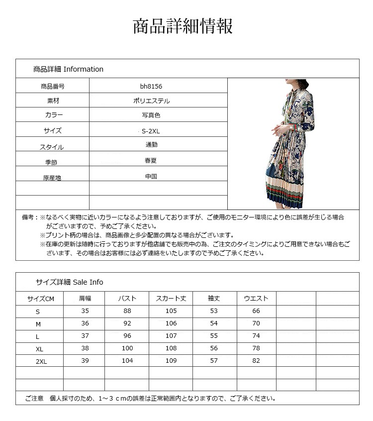■素材:ポリエステル■カラー:写真色■サイズ:Sバスト88袖丈53スカート丈105肩幅35ウエスト66Mバスト92袖丈54スカート丈106肩幅36ウエスト70Lバスト96袖丈55スカート丈107肩幅37ウエスト74XLバスト100袖丈56スカート丈108肩幅38ウエスト782XLバスト104袖丈57スカート丈109肩幅39ウエスト82■原産地:中国