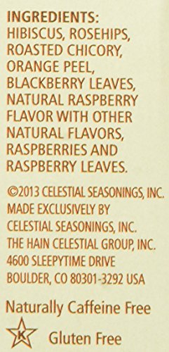 -. Feature : Raspberries with tart & tangy hibiscus / Naturally caffeine free / Contains no artificial flavors, colors or preservatives / Gluten free / Responsible packaging: recycled boxes & stringless tea bags help reduce waste