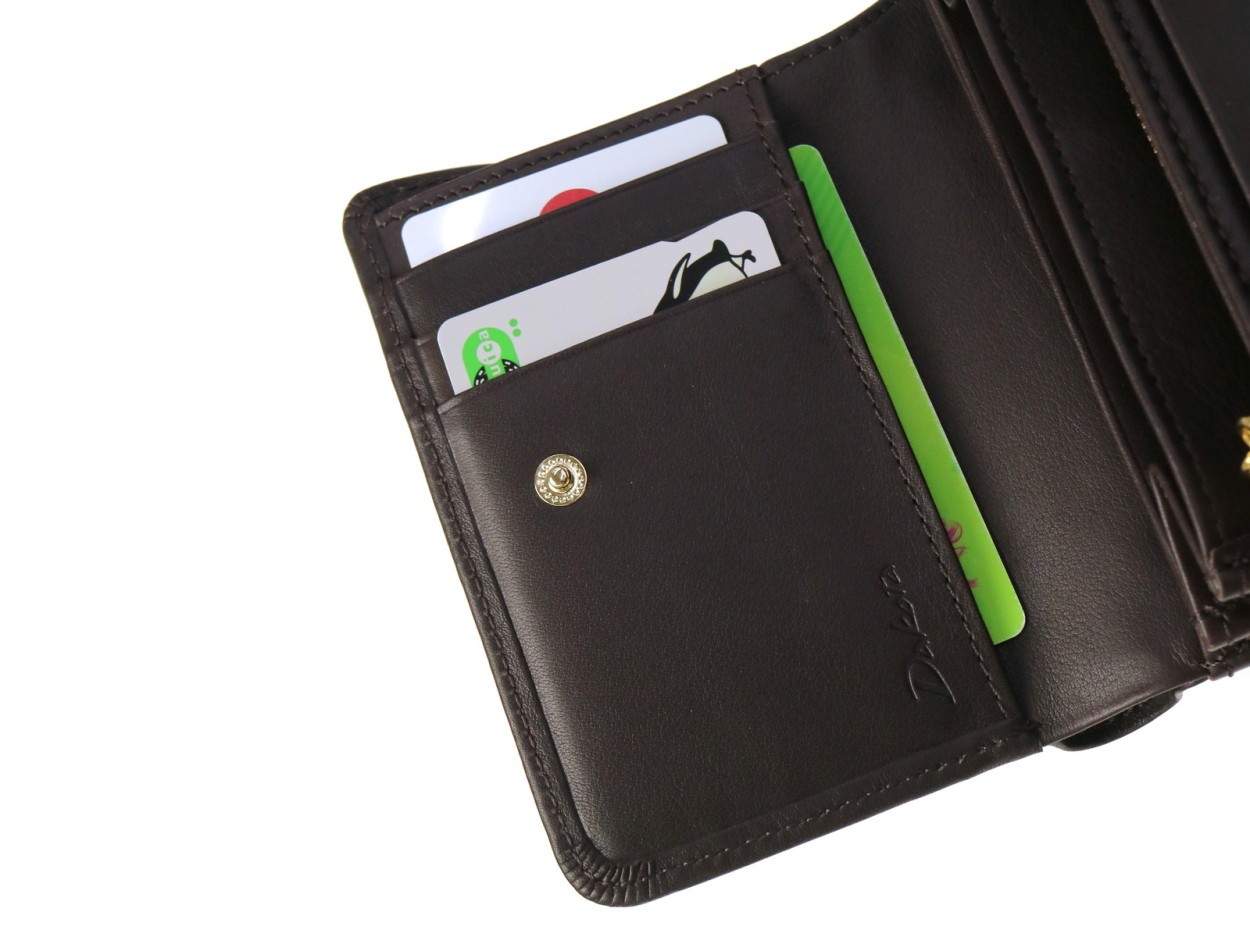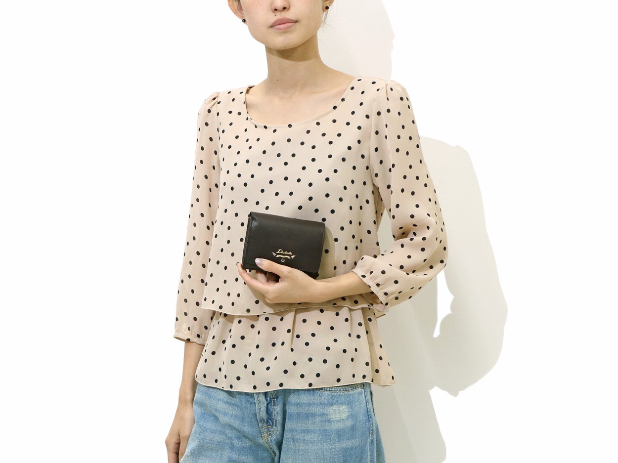 タッチ感が良く気持ちの良い持ち心地が魅力のイタリアンレザーを使用した「フォーチュン」シリーズの二つ折り財布。シンプルなデザインの中にゴールドのブローチがワンポイントになった大人可愛いデザインです。