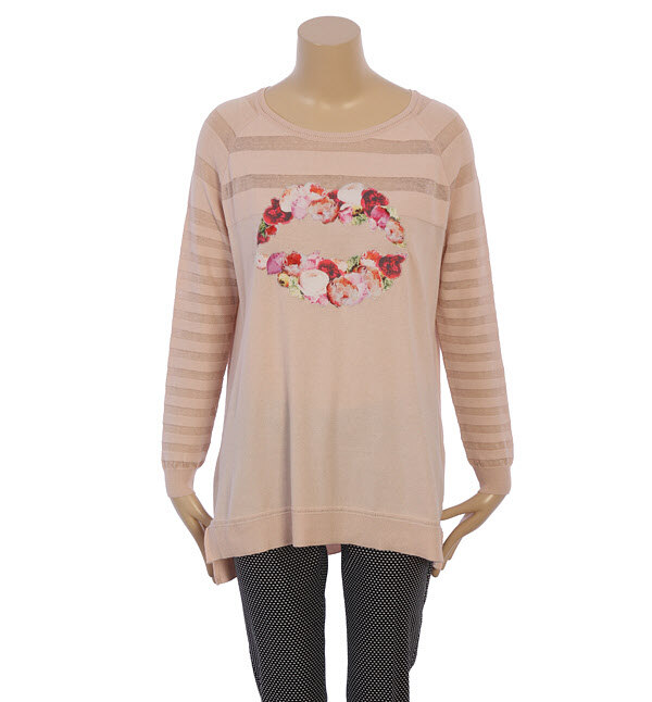 SISLEY, 시스루 스트라이프와 플라워 립프린트가 어우러져 한층 세련되고 걸리시한 분위기의 티셔츠입니다