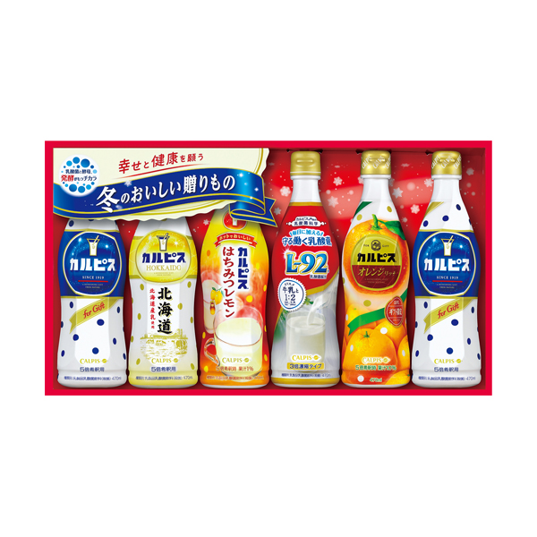 ●カルピスギフトが季節感、健康感をアップしてリニューアル。 ギフト限定の「カルピス北海道」と「カルピスオレンジリッチ」の品質感と、L92乳酸菌の希釈タイプが新登場。 さらに季節限定品として、ホットで飲むとおいしい「カルピス」はちみつレモンをアソートしました。