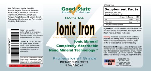 -. Binding : Health and Beauty -. Brand : Good State -. EAN : 0857515003107 -. Feature : Absorbs Much better than Pills! / Professional Grade - Natural - Made in USA / 48 Day Supply - 10 mg of Ionic Iron per Dose / Easy Measuring with Cap! / Easy to mix with Juice or Water -. Label : Good State -. Manufacturer : Good State -. Model : 199 -. MPN : 199 -. NumberOfItems : 1 -. PackageQuantity : 1 -. PartNumber : 199 -. ProductGroup : Health and Beauty -. ProductTypeName : HEALTH_PERSONAL_CARE -. PublicationDate : 2014-10-02 -. Publisher : Good State -. Studio : Good State -. Title : Good State - Liquid Ionic Minerals Iron (48 Days At 10mg. Plus 2 Mg Fulvic Acid) -. UPC : 857515003107