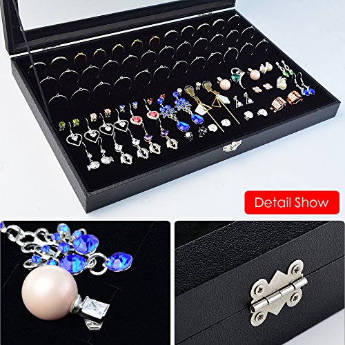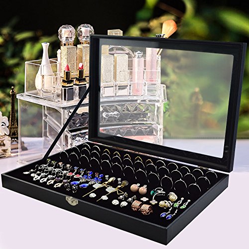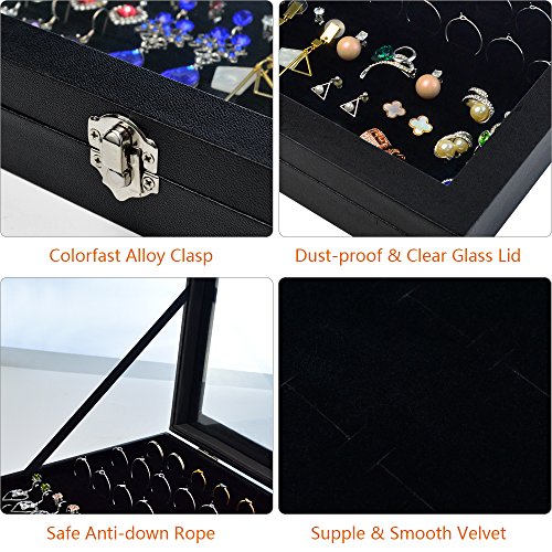 - UNIQUE, DURABLE & ATTRACTIVE DESIGN: Jewelry Organizer boasts a unique , beautiful and a more convenient design than the other jewelry boxes out there. The exterior is Black specialty fibreboard, velvet inside, and it features a clear glass- top lid that well dispaly your jewelry, and has effect of dust proof and security.