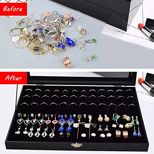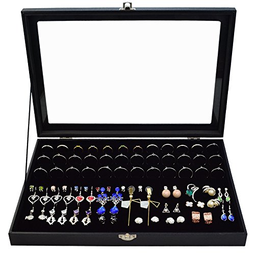 72 Slot Jewelry Ring Box Case Storage Tray Organizer for Jewelry Rings Earrings, Velvet Jewelry Display Storage Holder Tray Case Top Rings glass Display Showcase by cnomg Black