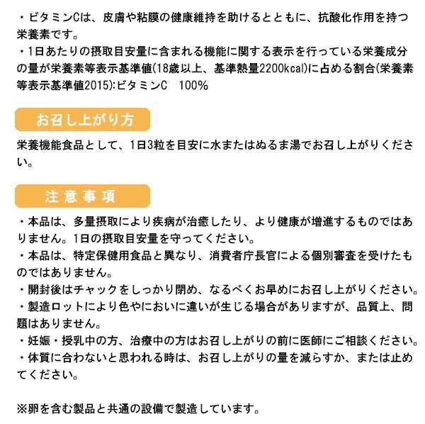 | 栄養成分 | 【3粒(900mg)あたり】 エネルギー:3.4kcal、たんぱく質:0g、脂質:0.018g、炭水化物:0.8g、食塩相当量:0.0005g、ビタミンC:100mg、菊花エキス末:100mg、タルトチェリーエキス末:100mg |