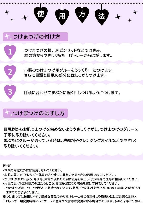 長いストレートの束感のあるまつげで、上品な目元を演出します。根元が黒いので、自然にアイラインを印象づけ、短いクロスの毛がより一層メリハリをだし、グラマラスな瞳になります。 |