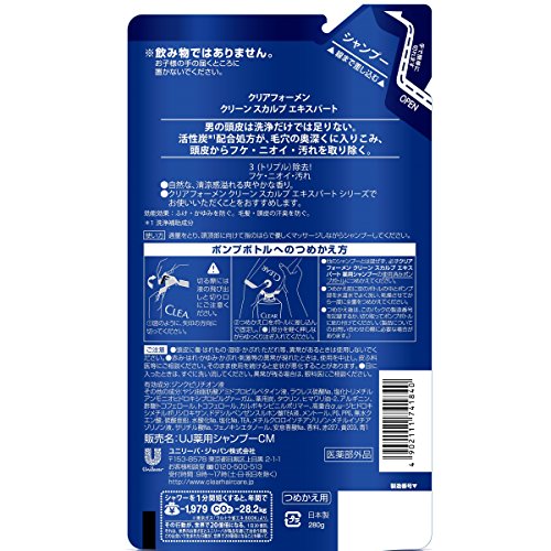 "280g refill clear for Men clean scalp medicated shampoo" is the three major scalp trouble of men, medicated shampoo to remove triple dandruff, odor, dirt (refill) . Activated carbon, active ingredient (zinc pyrithione solution), menthol (cooling) formulation. Pores dirt and of, the scalp of fat, sticky, also to clear the smell of the scalp to be worried about. Dandruff also firmly prevented by, washes clean. Natural, soft, great refreshing scent. Refill.